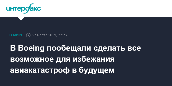 Москва. 27 марта. INTERFAX.RU - В компании Boeing заявили, что сделают все возможное, чтобы не допустить в будущем повторения несчастных случаев, подобных авиакатастрофам, произошедшим в Эфиопии и Индонезии.