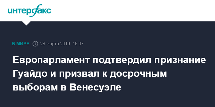 Москва. 28 марта. INTERFAX.RU - Европейский парламент принял в четверг на пленарной сессии в Страсбурге резолюцию в поддержку мирного решения кризиса в Венесуэле путем организации свободных, прозрачных и заслуживающих доверия президентских выборов.