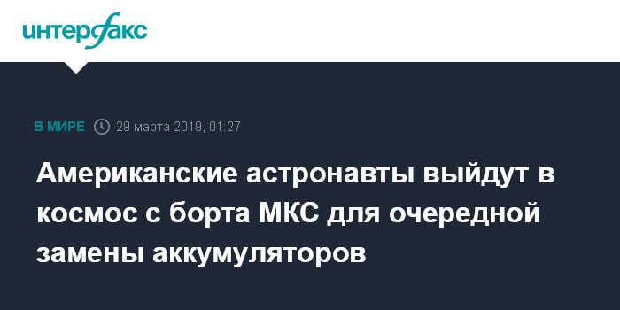 Москва. 29 марта. INTERFAX.RU - Американские астронавты в пятницу совершат второй с начала года выход в космос с борта Международной космической станции (МКС) для установки еще одного комплекта из трех новых аккумуляторов для ее солнечных панелей, сообщило Национальное управление по аэронавтике и исследованию космического пространства (NASA).