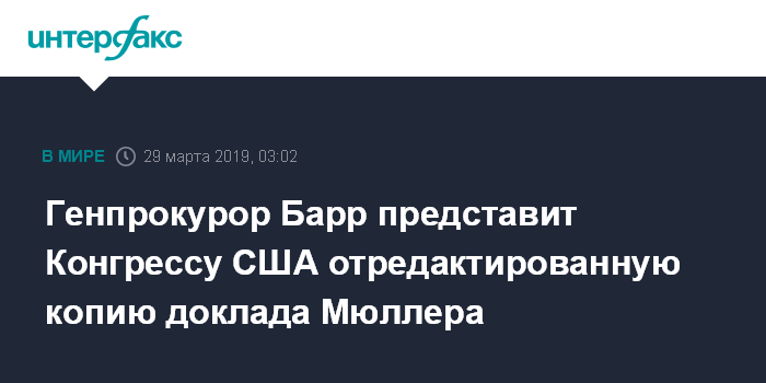 Уильям Барр, изучив доклад Роберта Мюллера, направил в Конгресс письмо, в котором говорилось, что спецпрокурор не увидел признаков сговора команды Дональда Трампа с РФ.