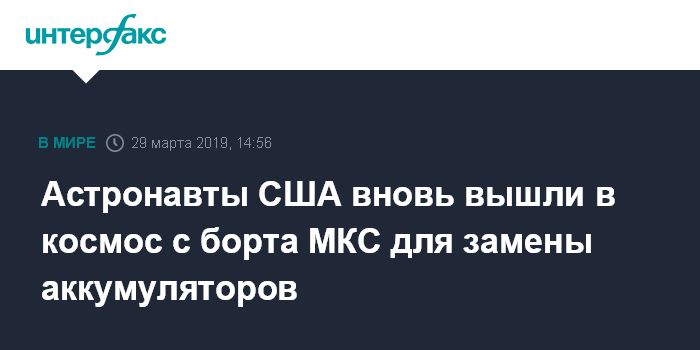 Москва. 29 марта. INTERFAX.RU - Американские астронавты в пятницу совершили второй с начала года выход в космос с борта Международной космической станции (МКС) для установки еще одного комплекта из трех новых аккумуляторов для ее солнечных панелей, сообщило Национальное управление по аэронавтике и исследованию космического пространства (НАСА).