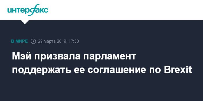 Москва. 29 марта. INTERFAX.RU - Премьер-министр Великобритании Тереза Мэй в пятницу в очередной раз призвала членов парламента поддержать согласованное с ЕС соглашение о Brexit, назвав его последней возможностью гарантировать выход страны из Евросоюза.