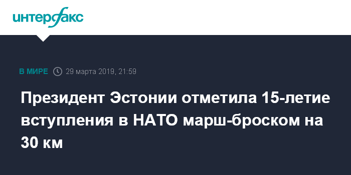 Москва. 29 марта. INTERFAX.RU - Президент Эстонии Керсти Кальюлайд отметила в пятницу 15-летие членства страны в НАТО участием в 30-километровом марш-броске ветеранов Сил обороны, военнослужащих, солдат союзников и представителей силовых структур.
