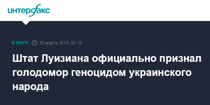 Москва. 30 марта. INTERFAX.RU - Американский штат Луизиана официально признал голодомор на Украине 1932-33 годов геноцидом украинского народа и почтил память погибших в этой трагедии украинцев, сообщило в пятницу посольство Украины в США.