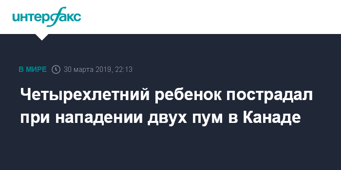 Москва. 30 марта. INTERFAX.RU - Четырехлетнего ребенка госпитализировали после нападения двух пум на острове Ванкувер в Канаде, сообщает в субботу телеканал CTV.