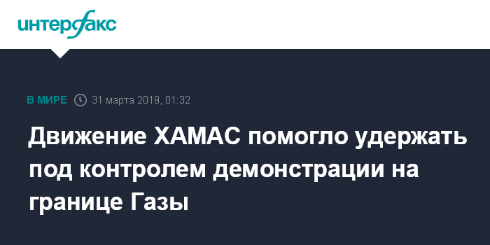 Москва. 31 марта. INTERFAX.RU - Палестинское движение ХАМАС помогло удержать под контролем масштабные антиизраильские демонстрации в субботу на границе сектора Газа, заявили власти Израиля.