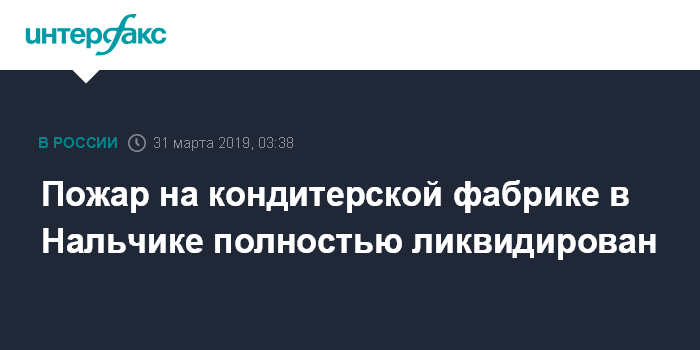 Москва. 31 марта. INTERFAX.RU - Полностью ликвидирован пожар на кондитерской фабрике на окраине Нальчика, сообщил агентству "Интерфакс" руководитель пресс-службы ГУ МЧС России по КБР Кантемир Беров в воскресенье.