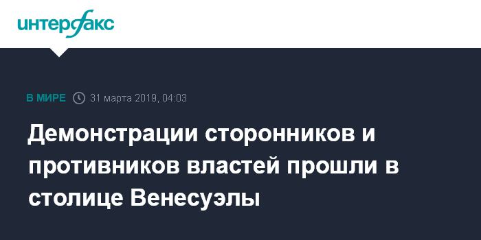 Москва. 31 марта. INTERFAX.RU - Выступления сторонников властей Венесуэлы и их противников, поддерживающих оппозицию, прошли в субботу в разных районах венесуэльской столицы Каракасе, сообщают СМИ с места событий.