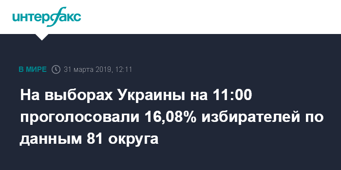Москва. 31 марта. INTERFAX.RU - Явка избирателей на выборах президента Украины по состоянию на 11:00 воскресенья составила 16,08% по данным 81 избирательного округа из 199 по всей стране, сообщается на сайте Центральной избирательной комиссии Украины.