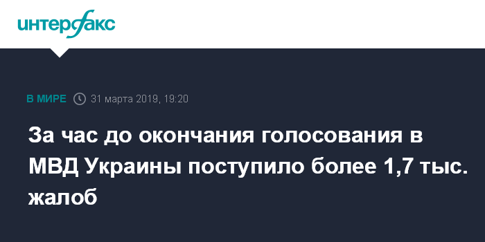 Москва. 31 марта. INTERFAX.RU - К 19:00 воскресенья в Национальную полицию Украины направлено 1768 заявлений и сообщений о правонарушениях в ходе выборов президента страны.