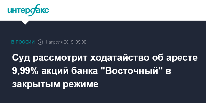 Суд рассмотрит ходатайство об аресте 9,99% акций банка "Восточный" в закрытым режиме
