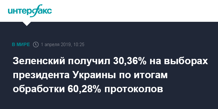 Москва. 1 апреля. INTERFAX.RU - Кандидаты в президенты Украины Владимир Зеленский и действующий глава государства Петр Порошенко набирают 30,36% и 16,40% голосов избирателей соответственно по итогам обработки 60,28% протоколов Центральной избирательной комиссией.