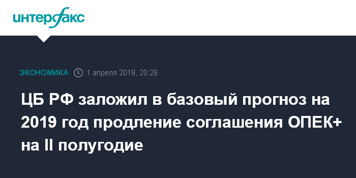 Москва. 1 апреля. INTERFAX.RU - ЦБ РФ заложил в базовый сценарий продление соглашения ОПЕК+ о сокращении добычи нефти во втором полугодии 2019 года, говорится в докладе регулятора о денежно-кредитной политике.