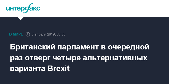 Москва. 2 апреля. INTERFAX.RU - В очередной раз британский парламент отверг 4 альтернативных варианта Brexit, итоги голосования в понедельник вечером озвучил спикер палаты общин Джон Беркоу.