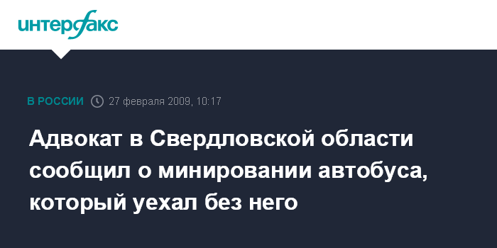 Москва. 27 февраля. INTERFAX.RU - В Свердловской области в четверг вечером нетрезвый адвокат региональной адвокатской палаты сообщил диспетчеру Белоярской автостанции о взрывном устройстве, якобы заложенном в междугородном пассажирском автобусе сообщением Екатеринбург - село Бутка.