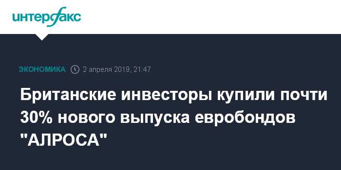 Москва. 2 апреля. INTERFAX.RU - Британские инвесторы стали самыми активными покупателями нового пятилетнего выпуска долларовых евробондов "АЛРОСА", который компания разместила для рефинансирования евробондов с погашением в 2020 году.