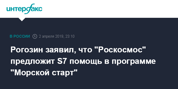 Москва. 2 апреля. INTERFAX.RU - Госкорпорация "Роскосмос" заинтересована в развитии принадлежащего компании S7 проекта Sea launch ("Морской старт"), заявил генеральный директор "Роскосмоса" Дмитрий Рогозин.