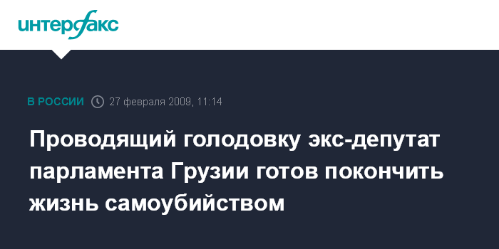 Москва. 27 февраля. INTERFAX.RU - Бывший депутат парламента Грузии Джемал Саджаиа, который пятнадцатый день проводит акцию голодовки в знак протеста в связи с выселением его многодетной семьи из дома, готов покончить жизнь самоубийством, если власти продолжат игнорировать его просьбу.