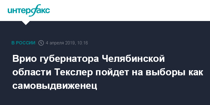 Москва. 4 апреля. INTERFAX.RU - Врио губернатора Челябинской области Алексей Текслер намерен участвовать в выборах главы региона в качестве самовыдвиженца.