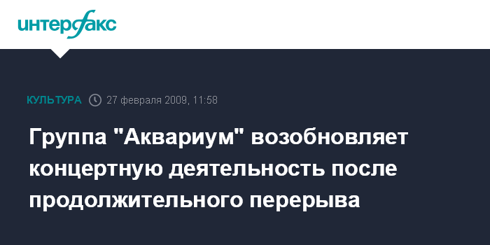 Москва. 27 февраля. INTERFAX.RU - Популярная рок-группа "Аквариум" приступает после продолжительного перерыва к концертной деятельности, говорится на официальном сайте коллектива.