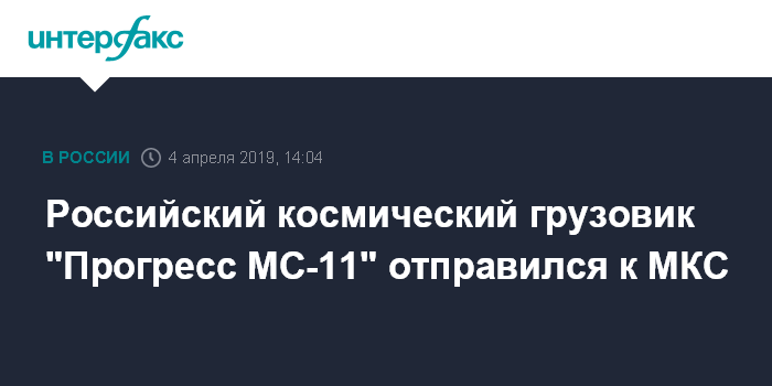 Москва. 4 апреля. INTERFAX.RU - Ракета-носитель "Союз" вывела на орбиту транспортный грузовой корабль (ТГК) "Прогресс МС-11" после старта с космодрома "Байконур" в четверг, передает корреспондент "Интерфакса" из подмосковного Центра управления полетами.