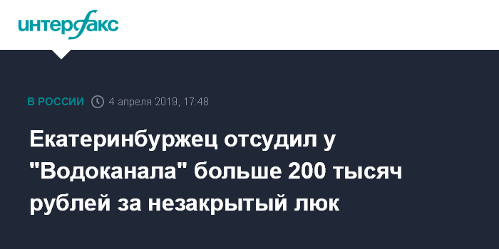 Москва. 4 апреля. INTERFAX.RU - Суд в Екатеринбурге взыскал с городского "Водоканала" 200 тысяч рублей в качестве компенсации за ремонт его автомобиля, который наехал на открытый люк, сообщает пресс-служба областного суда.