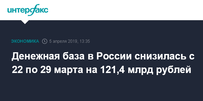 На 22 марта денежная база в России равнялась 10226,3 млрд рублей. Таким образом, за период она снизилась на 1,19%, или на 121,4 млрд рублей.