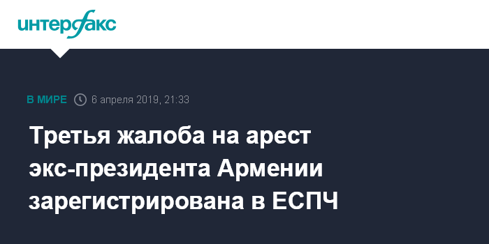 Москва. 6 апреля. INTERFAX.RU - Европейский суд по правам человека (ЕСПЧ) зарегистрировал третью жалобу, поданную адвокатами экс-президента Армении Роберта Кочаряна на арест подзащитного по обвинению в свержении конституционного строя страны.