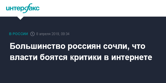 Москва. 8 апреля. INTERFAX.RU - Почти две трети россиян (64%) уверены, что законы о наказании за оскорбление госсимволов и распространение недостоверных новостей в интернете приняты, чтобы воспрепятствовать критике властей; об этом свидетельствуют данные опроса "Левада-центра", поступившие в понедельник в "Интерфакс".