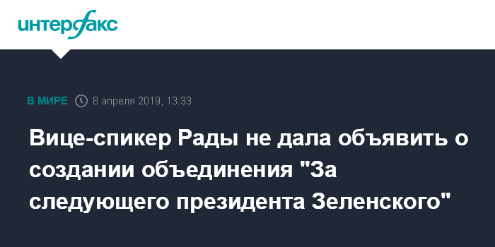 Москва. 8 апреля. INTERFAX.RU - Первый вице-спикер Верховной рады Украины Ирина Геращенко не позволила депутату Виталию Куприю сообщить о создании межфракционного депутатского объединения "За следующего президента Зеленского" на согласительном совете парламента. Согласно процедуре, чтобы объединение начало свое существование, председательствующий должен объявить о его создании на пленарном заседании.