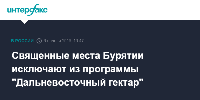Москва. 8 апреля. INTERFAX.RU - Власти Бурятии попросили исключить из программы "Дальневосточный гектар" 750 священных мест, расположенных на территории региона; данные об этих объектах направлены в Росреестр, сообщает пресс-служба правительства республики.