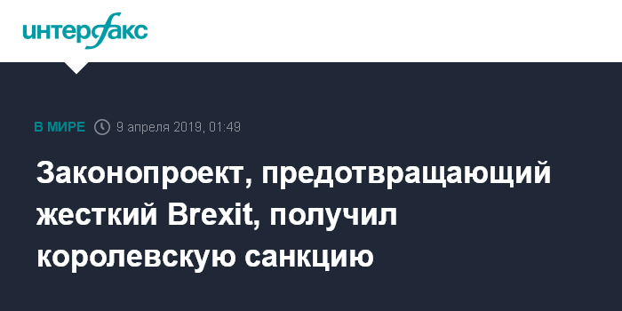 Москва. 9 апреля. INTERFAX.RU - Законопроект, предотвращающий выход Великобритании из ЕС без соглашения, получил одобрение королевы и стал законом.