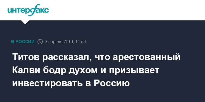 Титов рассказал, что арестованный Калви бодр духом и призывает инвестировать в Россию
