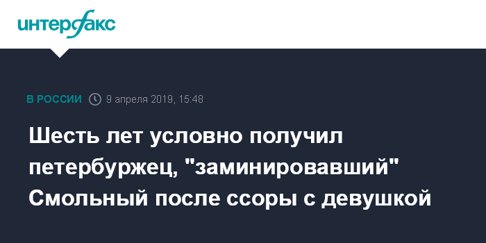 Москва. 9 апреля. INTERFAX.RU - Куйбышевский суд Петербурга приговорил к шести годам условно Алексея Кузнецова, который в состоянии алкогольного опьянения после ссоры с девушкой сообщил в полицию, что взорвет здание правительства города, сообщает во вторник объединенная пресс-служба судов города.