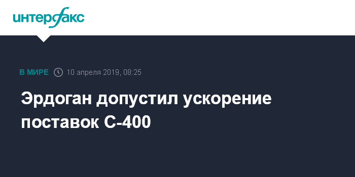 Москва. 10 апреля. INTERFAX.RU - Президент Турции Реджеп Тайип Эрдоган заявил, что поставки российских ЗРК С-400 могут начаться раньше запланированного срока - июля 2019 года, сообщила проправительственная газета Sabah в среду.