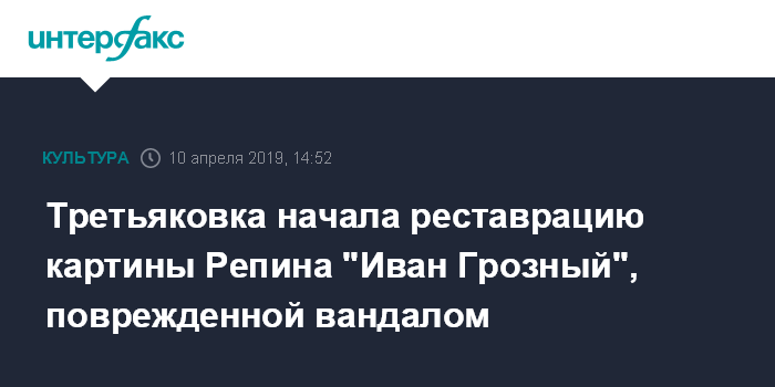 Москва. 10 апреля. INTERFAX.RU - Третьяковская галерея приступила к первому этапу реставрации картины Ильи Репина "Иван Грозный", которую посетитель повредил в мае 2018 года года, сообщила пресс-служба музея сообщила журналистам в среду.
