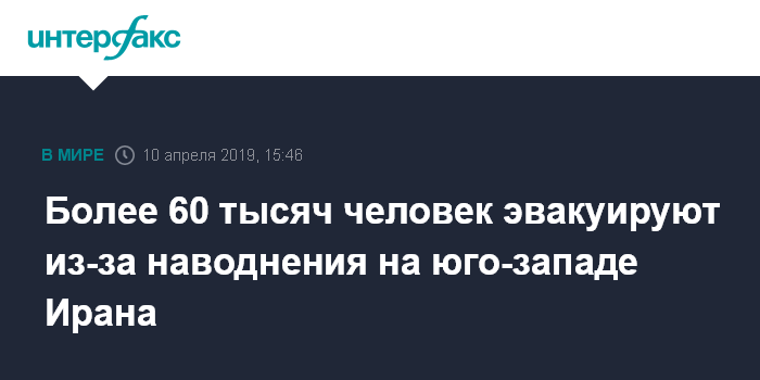 Москва. 10 апреля. INTERFAX.RU - Иранские власти проводят эвакуацию около 60 тысяч человек из города Ахваз (провинция Хузестан) на юго-западе страны из-за угрозы наводнения, пишет в среду Daily Mail сос ссылкой на иранской информагентство Tasnim.