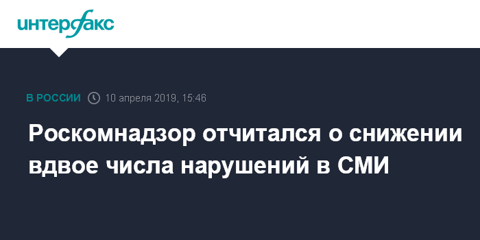 Москва. 10 апреля. INTERFAX.RU - Средства массовой информации в среднем в два раза реже стали нарушать законодательство, сообщили в Роскомнадзоре.