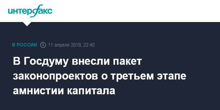 Москва. 11 апреля. INTERFAX.RU - Правительство РФ внесло в Госдуму законопроекты о третьем этапе амнистии капитала, который пройдет с 1 мая 2019 года по 29 февраля 2020 года.