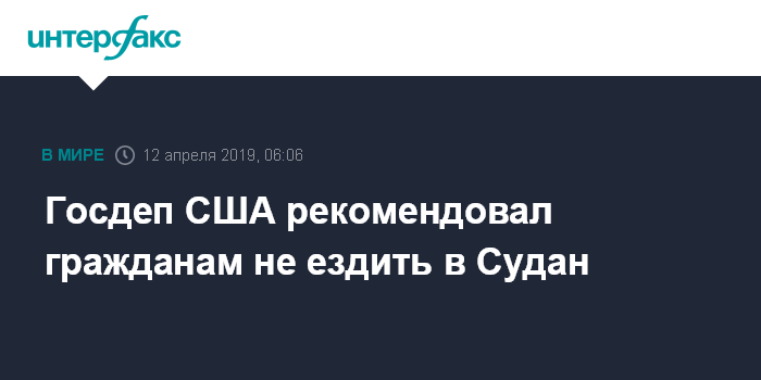 Москва. 12 апреля. INTERFAX.RU - Госдепартамент США обновил рекомендации по поездкам в Судан, поставив страну на четвертый уровень опасности.