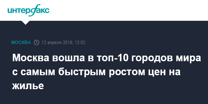 Москва. 12 апреля. INTERFAX.RU - Москва заняла шестую строчку в рейтинге из десяти городов с наиболее быстрым ростом цен на жилье, говорится в исследовании Global Living, которое опубликовала консалтинговая компания в области недвижимости CBRE.