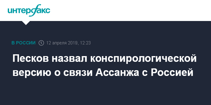 Москва. 12 апреля. INTERFAX.RU - Пресс-секретарь президента РФ Дмитрий Песков назвал конспирологическими версии о том, что арест основателя WikiLeaks Джулиана Ассанжа может как-то отразиться на России.