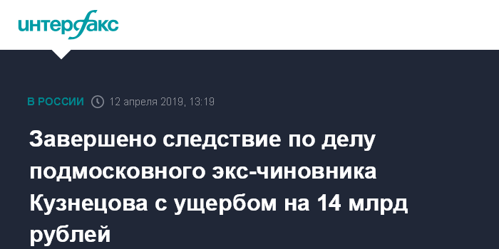 Москва. 12 апреля. INTERFAX.RU - Следственный комитет РФ сообщил о завершении следственных действий по уголовному делу экс-зампредседателя правительства Подмосковья Алексея Кузнецова, обвиняемого в мошенничестве, растрате и легализации денег, полученных преступным путем.