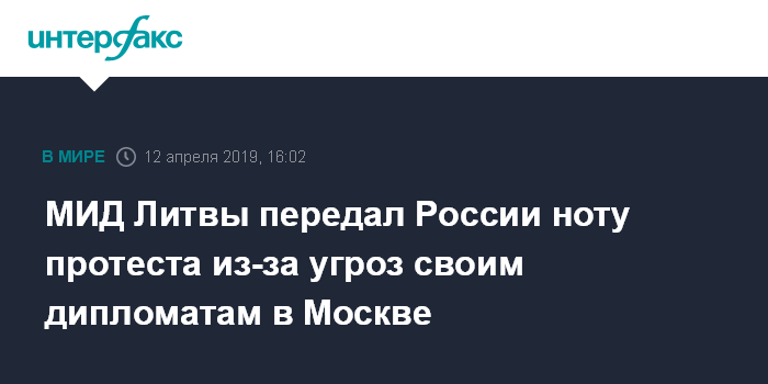Москва. 12 апреля. INTERFAX.RU - МИД Литвы сообщил, что вручил российской стороне ноту протеста из-за угроз, поступивших в адрес сотрудников литовского посольства в Москве и членам их семей.