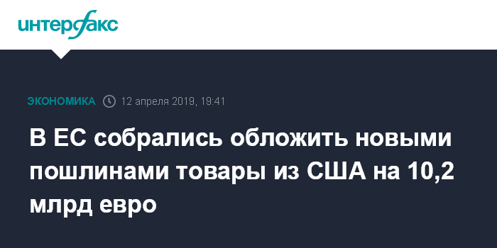Москва. 12 апреля. INTERFAX.RU - Евросоюз изучает возможность введения новых пошлин на товары американского экспорта объемом 10,2 млрд евро в качестве ответных мер на действия США, сообщает агентство Bloomberg.