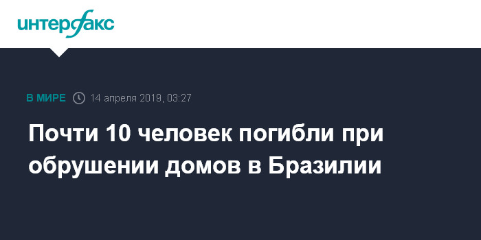 Москва. 14 апреля. INTERFAX.RU - По меньшей мере восемь человек погибли под завалами жилых домов в Рио-де-Жанейро, сообщило в воскресенье агентство Associated Press.