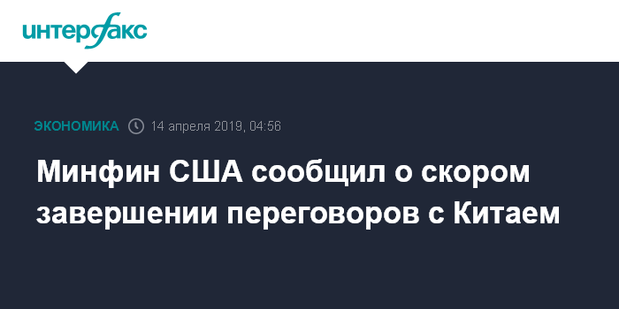 Москва. 14 апреля. INTERFAX.RU - Власти США и КНР близки к тому, чтобы приступишь к финальной части переговоров по торговому соглашению, заявил американский министр финансов Стивен Мнучин.