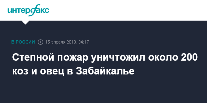 В свою очередь замруководителя администрации Борзинского района по территориальному развитию Николай Тимофеев уточнил агентству, что по предварительным данным, в огне погибло около 200 коз и овец, один теленок и одна лошадь.