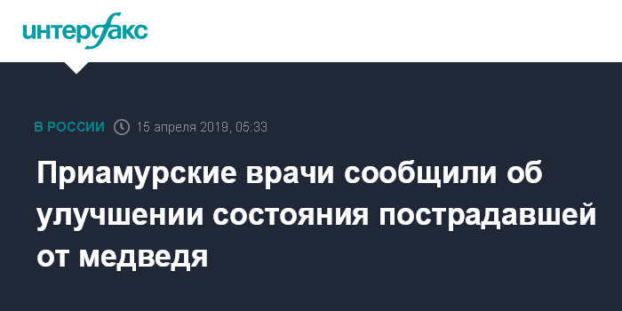 Москва. 15 апреля. INTERFAX.RU - Медики отмечают заметное улучшение состояния женщины, которая пострадала неделю назад от медведя на базе отдыха в Амурской области.