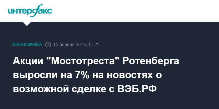 Москва. 15 апреля. INTERFAX.RU - Акции "Мостотреста" выросли в начале торгов на Московской бирже более чем на 7% (до 103,5 рубля за штуку) на сообщениях СМИ о возможной покупке ВЭБ.РФ крупного пакета бумаг компании.